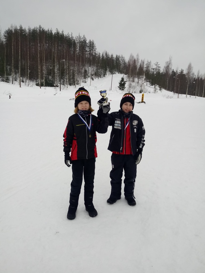 ![]() Otto Konttinen ja Sisu Suvinen Kalevi Hämäläisen muistohiihdoissa Juvalla 28.12.2019. Sisu hiihti upeasti hopealle M12 sarjassa ja Otto oli neljäs M14 sarjassa. Hienoa menoa molemmilta pojilta. |
