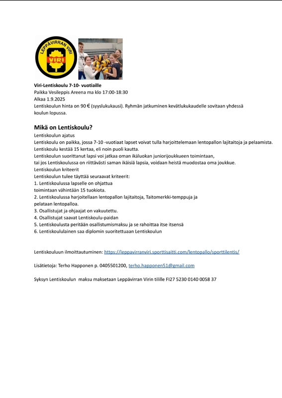 Lenttiskouluun ilmottautuminen: https://leppavirranviri.sporttisaitti.com/lentopallo/sporttilentis/